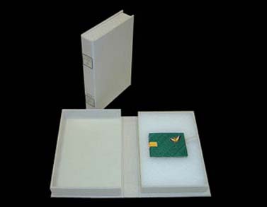Based on a standard size, a clamshell box with foam filler was created to house a miniature artist's book. Cotton tape secured beneath the foam was added to gently lift the book from the foam insert.